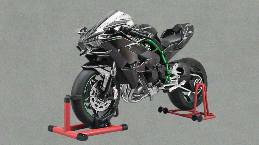 Como suponemos que ya lo has adivinado, la moto deportiva de las imágenes se trata de una maqueta metálica a escala 1/16 de la Kawasaki Ninja H2R, fabricada por Nikola Toy. Viene con unos diminutos caballetes delantero y trasero, así como con un pequeño embudo que puedes usar para llenar el depósito de gasolina cuando hayas terminado de montarla.