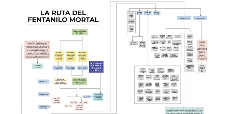 En el expediente, y basado en la documentación que recabó el juzgado de Kreplak en menos de tres meses de investigación, se revela la “cadena de comercialización de los Lotes 31.202 y 31.244 del fentanilo HLB”. Allí se describe que los lotes del “fentanilo contaminado se produjeron en el Laboratorio Ramallo S.A., y HLB Pharma los sacó a la venta el 4/1/25 (lote 31.202) y el 6/1/25 (lote 31.244)”.