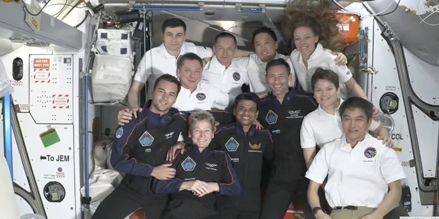 Hablando tanto en inglés como en sus lenguas maternas, los recién llegados compartieron abrazos y apretones de manos con los siete residentes permanentes de la estación espacial, celebrando con bolsas de bebidas que bebieron con pajitas. Seis países estuvieron representados: cuatro de EE. UU., tres de Rusia y uno de Japón, India, Polonia y Hungría.
