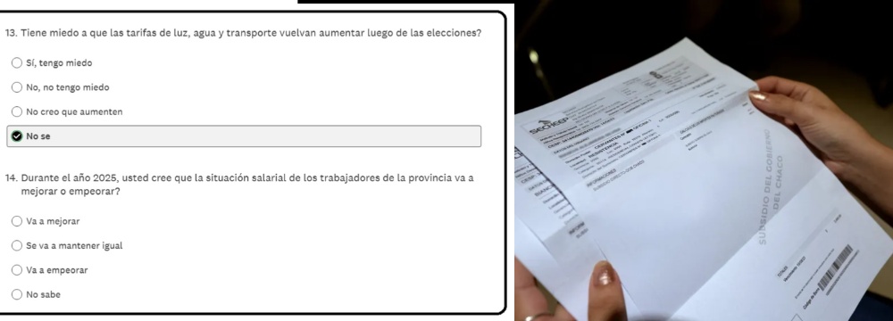 El cuestionario, de marcado sesgo oficialista, incluye preguntas reveladoras: “¿Tiene miedo a que las tarifas de luz, agua y transporte vuelvan a aumentar luego de las elecciones?”. La consulta no es inocente por lo que surge un interrogante adicional ¿Es un guiño a lo que ya planea el gobierno de Leandro Zdero, cuyo mandato está marcado por aumentos de hasta el 700% en la energía eléctrica, sumiendo a familias en la angustia de recibir boletas de hasta 250 mil pesos mensuales?.