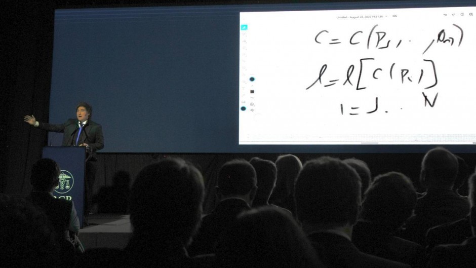 Los que escuchaban sentados en el colmado auditorio Belgrano de la Bolsa de Rosario no podían moverse. Los que estaban en el recinto de corredores bursátiles donde hay pantallas gigantes sí podían hacerlo y hablaban como en un aeropuerto completamente al margen de un discurso sobre el overshooting, de la economía de dos períodos y de los gráficos sobre fórmulas dibujados a las espaldas del presidente.