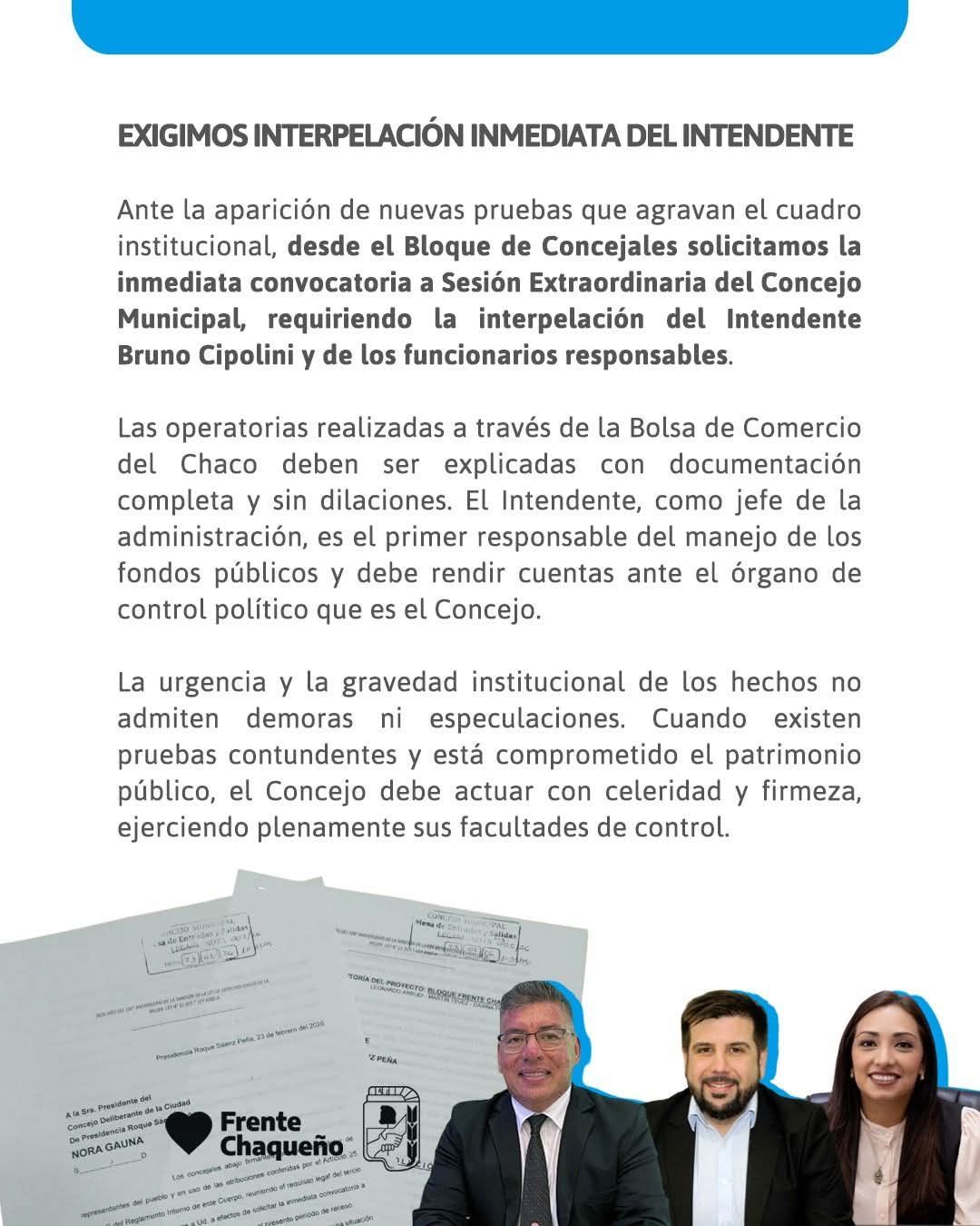 El Bloque Frente Chaqueño hace un llamado urgente al Concejo Deliberante a que asuma su rol de control y fiscalización con seriedad. La interpelación al intendente Cipolini y a sus funcionarios es una medida que no puede esperar más. No se trata solo de una cuestión política, sino de una gravísima cuestión de responsabilidad y de respeto hacia los ciudadanos de Sáenz Peña, quienes necesitan respuestas claras ante este presunto desvío de recursos públicos.